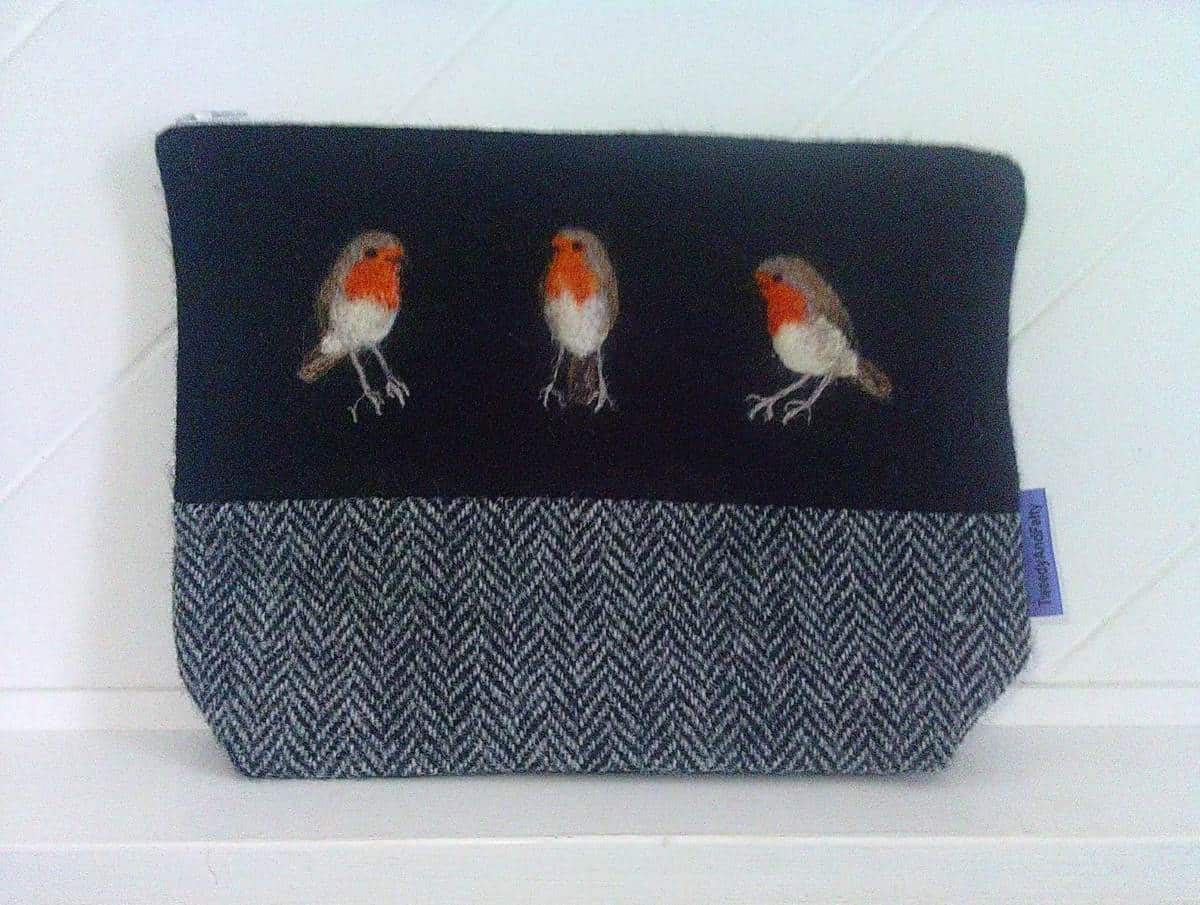 Handmade cosmetic/toiletry bag from two lovely Harris Tweeds, a black twill and a black and pale grey herringbone. A trio of robins have been needle felted on using Merino wool tops. The lining can be wiped clean and the bag should be sponge cleaned. There is a Harris Tweed label on the back.
