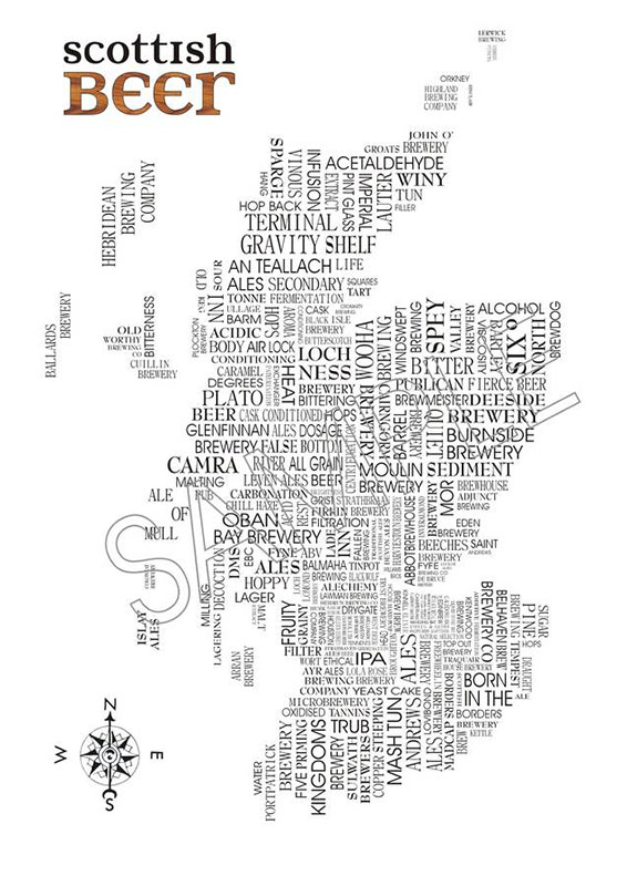With real ale and craft beer becoming more popular you’re bound to know someone who will love this Scottish brewery map which has been created using place names of breweries, and brewing terms.